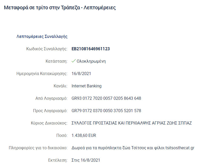 Σας επισυνάπτω αποδεικτικά των καταθετηρίων (το format στην περίπτωση του Ranch-eros ειναι διαφορετικό γιατί το ποσό στάλθηκε σε διαφορετική τράπεζα μεσω εμβάσματος – στις άλλες περιπτώσεις εστάλησαν στην ίδια τράπεζα) ενώ σύντομα θα μου στείλουν και σχετικές αποδείξεις οι φορείς οι οποίες μόλις ληφθούν θα δημοσιευτούν και αυτές εδώ