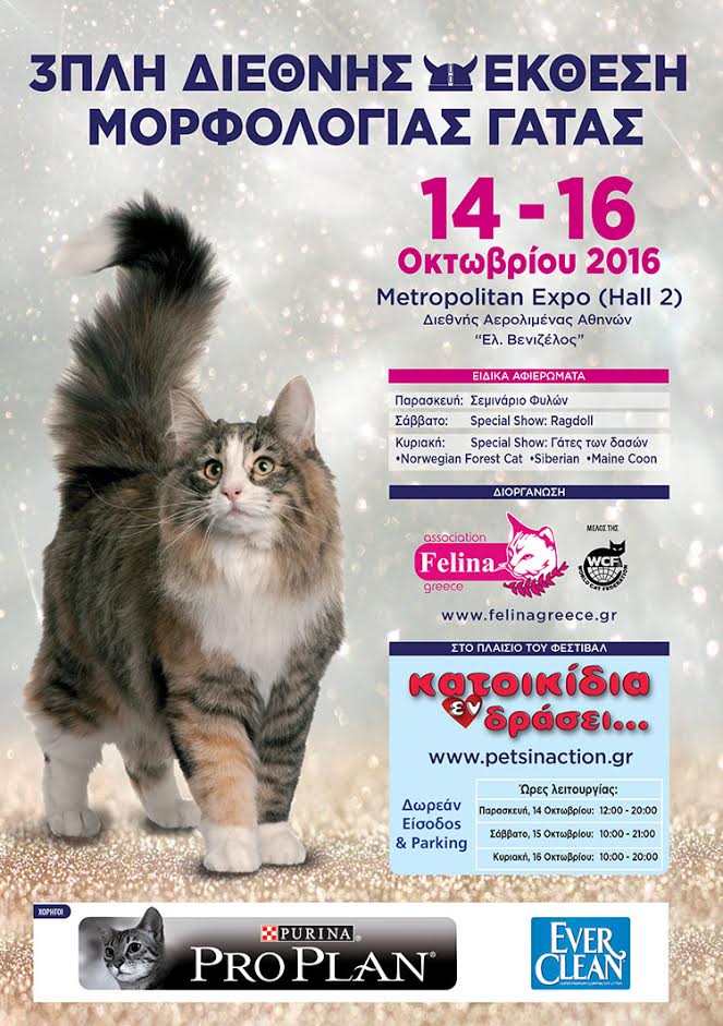 Το τριήμερο 14 – 16 Οκτωβρίου 2016 το μεγαλύτερο εκθεσιακό κέντρο της χώρας, «Metropolitan Expo» (Hall 2) θα φορέσει τα γιορτινά του για να σας υποδεχτεί σε ένα φεστιβάλ, που θα ικανοποιήσει και τον πλέον απαιτητικό ζωοφιλία.