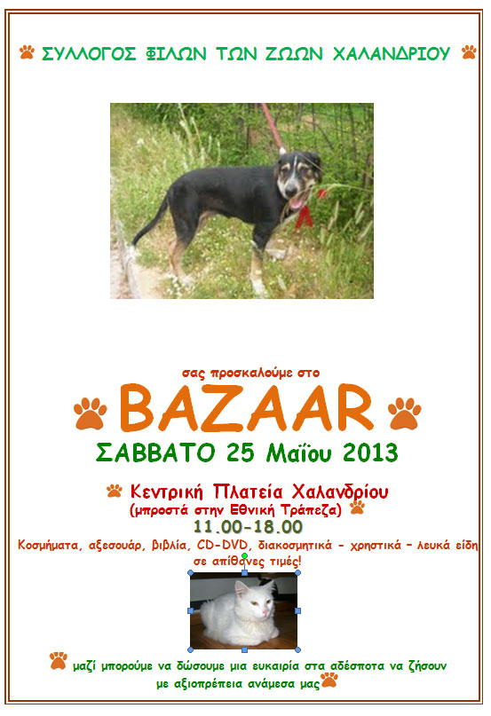 Σας ενημερώνουμε οτι το επόμενο Σάββατο 25 Μαΐου θα πραγματοποιηθεί μπαζάρ στην Κεντρική Πλατεία Χαλανδρίου. Η εκδήλωση θα ξεκινήσει στις 11.00 το πρωί και θα διαρκέσει μέχρι τις 18.00 το απόγευμα.
