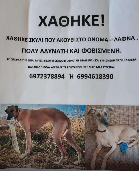 Χάθηκε στο νέο λιμάνι της Πάτρας η «Dafna». Η σκυλίτσα, η οποία είναι τσιπαρισμένη, είναι ράτσας γκρέι χάουντ και την έχασαν οι Ρώσοι ιδιοκτήτες της, οι οποίοι βρίσκονται με τροχόσπιτο στο νέο λιμάνι, ενώ ετοιμάζονταν να ταξιδέψουν. Μάλιστα δηλώνουν ότι δεν πρόκειται να φύγουν αν δεν την βρουν.