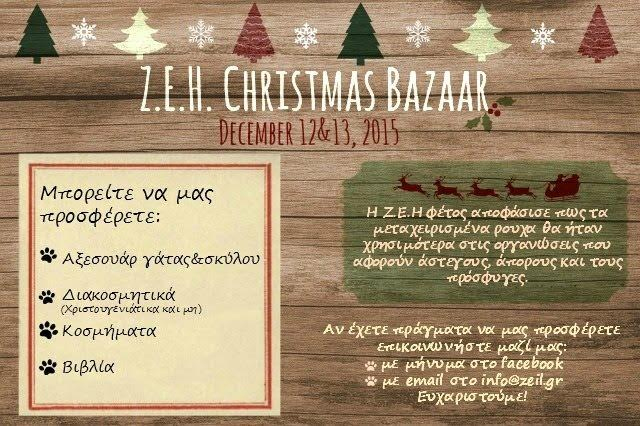 »Ακόμη και αν δεν θέλετε να ξοδέψετε πολλά χρήματα, ελάτε να γνωριστούμε και να περάσετε ευχάριστα ένα πρωί ή απόγευμα, με τα παιδιά σας ή τα σκυλιά σας ή -ακόμα καλύτερα- με όλους μαζί! Δεχόμαστε με χαρά δωρεές αντικειμένων που για τα ζώα σας δεν είναι πια χρήσιμα αλλά για τα αδέσποτα είναι σημαντικά, όπως λουράκια, κουβέρτες, παλιά σπιτάκια/καλαθάκια/κλουβιά μεταφοράς, καθώς και τροφές. Στο παζάρι μας συγκεντρώνουμε και τρόφιμα μακράς διαρκείας για τους συμπολίτες μας που αντιμετωπίζουν δυσκολίες» προστίθεται στην ανακοίνωση του συλλόγου.