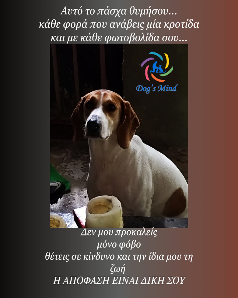 Κάθε χρόνο Πάσχα ή Χριστούγεννα εκατοντάδες χιλιάδες σκύλοι στην χώρα μας βιώνουν τον τρόμο ενός αόρατου εχθρού! Την ίδια στιγμή που ο άνθρωπος πανηγυρίζει, τετράποδοι κατα δήλωση του φίλοι χάνονται πηδώντας φράχτες, παθαίνουν κρίσεις και καταλήγουν κάτω από έπιπλα βιώνοντας τον απόλυτο πανικό και κάποιοι ζουν την τελευταία τους στιγμή στον ήχο ενός πυροτεχνήματος πηδώντας από ένα μπαλκόνι ή καταλληγοντας στις ροδες ενος αυτοκινητου στην προσπάθεια τους να προφυλαχθούν! Ο άνθρωπος στην κορυφή της τροφικής πυραμίδας μετά από εκατομμύρια χρόνια εξέλιξης δεν πάβει να φέρεται ώς ένα κακομαθημένο παιδί χωρίς επίγνωση των πράξεών του!