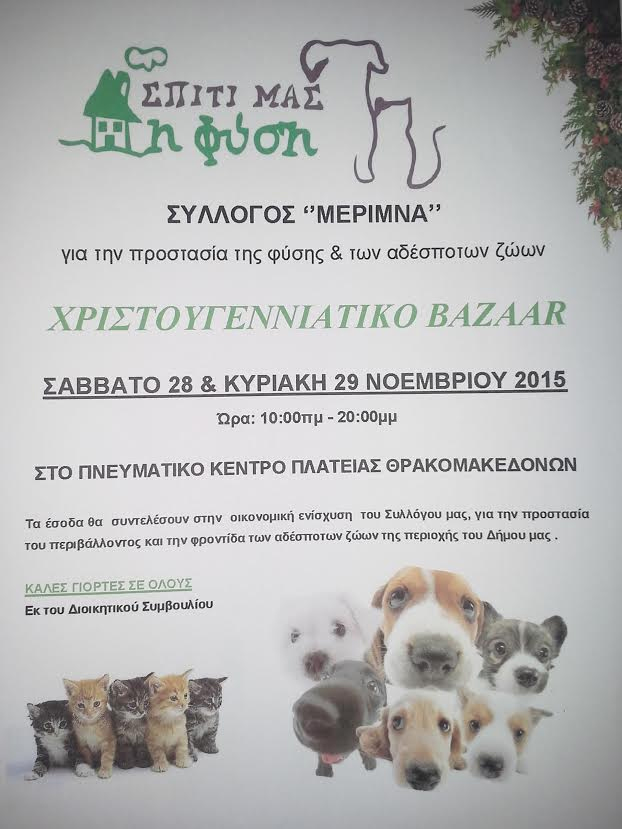 Ο Σύλλογος «Μέριμνα» για την προστασία της φύσης και των αδέσποτων ζώων πραγματοποιεί το Σάββατο 28 και την Κυριακή 29 Νοεμβρίου Χριστουγεννιάτικο Bazaar στο Πνευματικό Κέντρο της Πλατείας Θρακομακεδόνων.