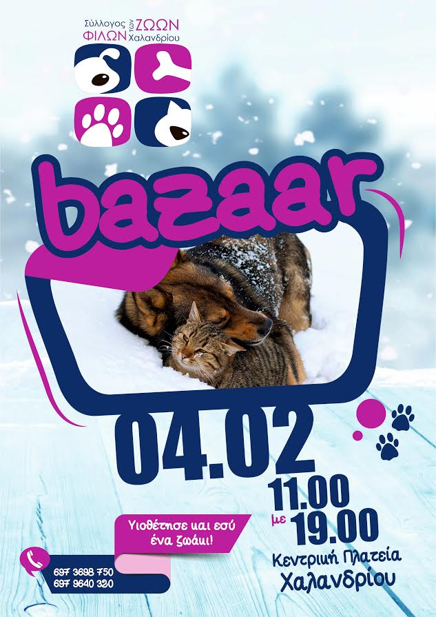 Το bazaar του Συλλόγου Φίλων των Ζώων Χαλανδρίου θα γίνει το Σάββατο 4 Φεβρουαρίου στην κεντρική πλατεία της πόλης, και συγκεκριμένα στα σκαλοπάτια μπροστά στην Εθνική Τράπεζα.
