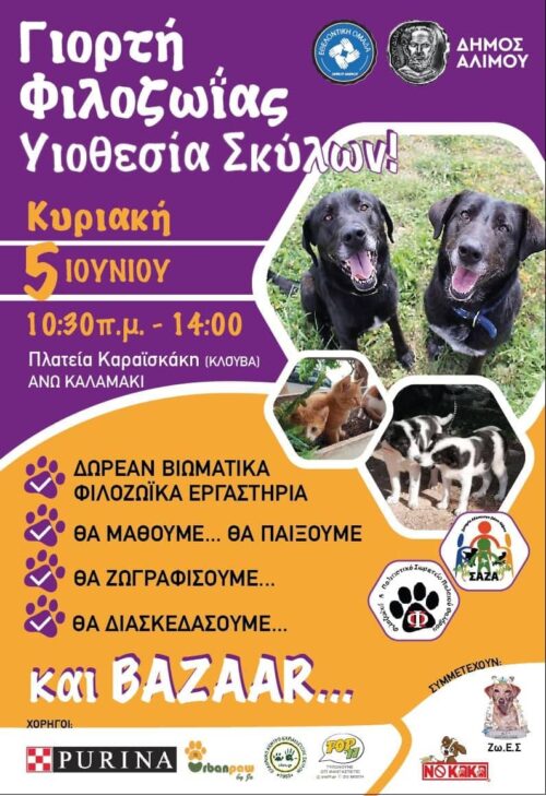 Την Κυριακή 5 Ιουνίου, 10:30 π.μ. – 14:00, στην Πλατεία Καραϊσκάκη (Κλούβα) στο Άνω Καλαμάκι (Λεωφ. Ιωνίας) δεκάδες αδέσποτα σκυλάκια ψάχνουν στέγη. Ψάχνουν ένα χάδι και την αγάπη μιας οικογένειας.