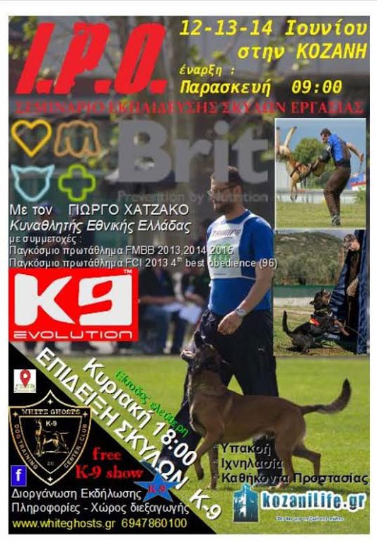 Με αφορμή τα εγκαίνια του Κυναθλητικού Ομίλου WHITE GHOSTS, ο Όμιλος διοργανώνει τη μεγαλύτερη εκδήλωση που έχει γίνει ποτέ στην Κοζάνη με τριήμερο σεμινάριο εκπαίδευσης σκύλων εργασίας I.P.O: από την Παρασκευή 12 Ιουνίου 2015 (09.00 το πρωί) μέχρι την Κυριακή 14 Ιουνίου 2015 (18.00 το απόγευμα με εντυπωσιακή επίδειξη σκύλων Κ-9 & I.P.O).