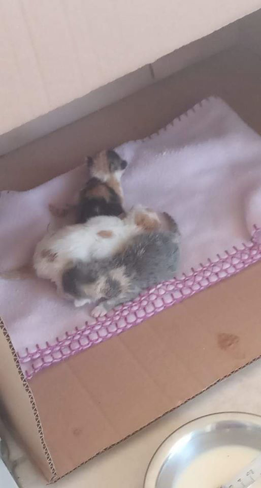 «Είναι μερικών ημερών και δεν έχουν ανοίξει τα ματάκια τους, οπότε, εκτός της φιλοξενίας, εάν υπάρχει κάποιος του οποίου η γάτα έχει γεννήσει πρόσφατα για να τα θηλάσει (και να τα αναλάβει για κάποιο διάστημα μέχρι να βρεθεί κάποιος να τα πάρει) είναι ευπρόσδεκτος» αναφέρει η Μαρία που τα εντόπισε.