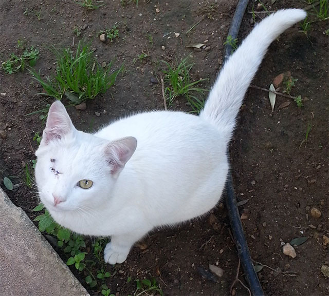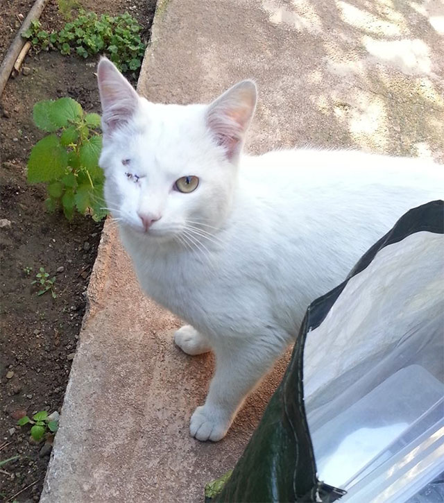 Ο λευκός γάτος της φωτογραφίας έχει ταλαιπωρηθεί πολύ, καθώς χρειάστηκε να υποβληθεί σε χειρουργική επέμβαση στο μάτι.