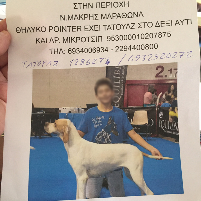 Το Pointer της φωτογραφίας, χάθηκε το Σάββατο στους δρόμους της Νέας Μάκρης. Έχει τατουάζ στο δεξί αυτί. Παρακαλείται όποιος το εντοπίσει να επικοινωνήσει με τα παρακάτω τηλέφωνα...