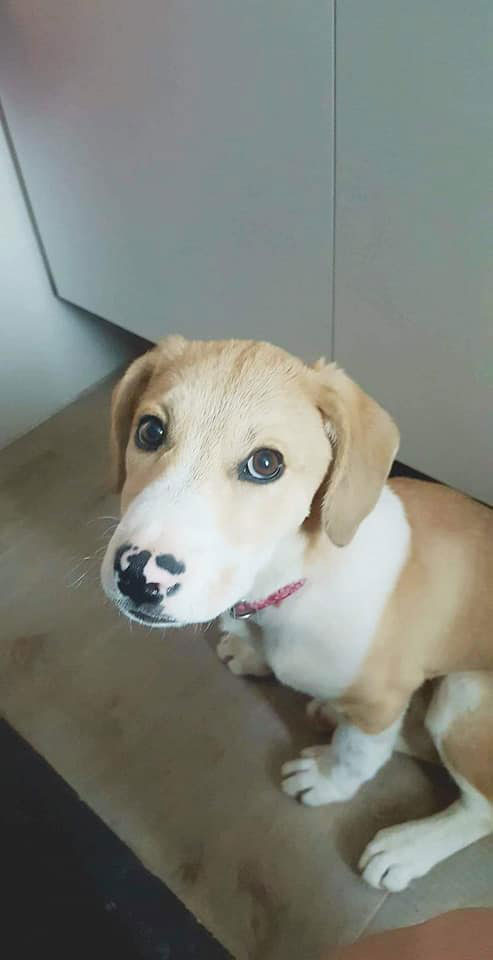 Είναι περίπου 6 μήνων, γύρω στα 12 κιλα, φοράει ροζ κολλάρο. Δεν είναι ράτσα, ούτε στειρωμένη και δυστυχώς δεν φέρει τσιπ γιατί την υιοθετήσαμε πρόσφατα από τον δρόμο. Την λένε Μπαχάρ. Είναι πολύ φιλική και ανταποκρίνεται στο όνομά της.