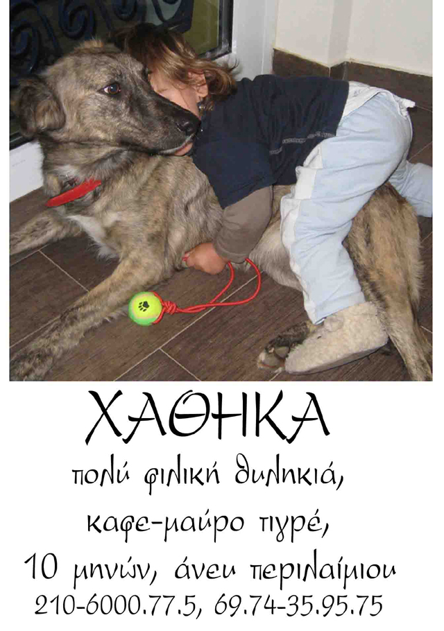 Χάθηκε στις 25/11 στην περιοχή Πευκάκια Αγίας Παρασκευής, ανάμεσα στην Κλεισθένους, Αττική οδό, Μεσογείων και Δ. Πλακεντίας, σκυλίτσα τιγρέ, με μαύρο, γκρι, καφέ χρώμα, χωρίς περιλαίμιο, 10 μηνών.