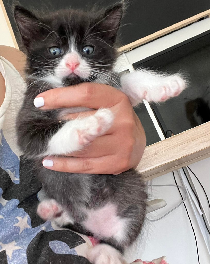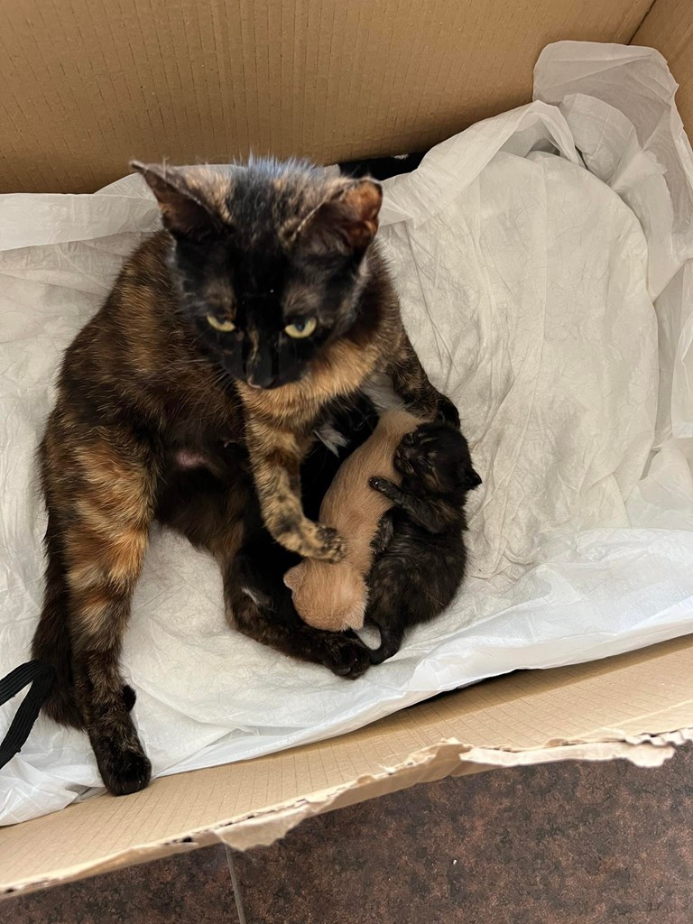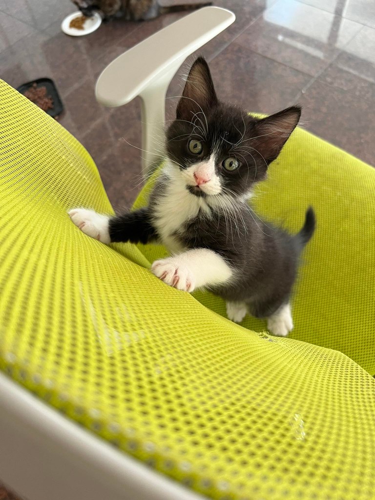 Τα γατάκια είναι περίπου δύο μηνών και η μαμά τους 7-8 μηνών. Το ασπρόμαυρο είναι αγοράκι και το ταρταρουγάκι κοριτσάκι. Τρώνε μόνα τους και πάνε στην άμμο κανονικά.