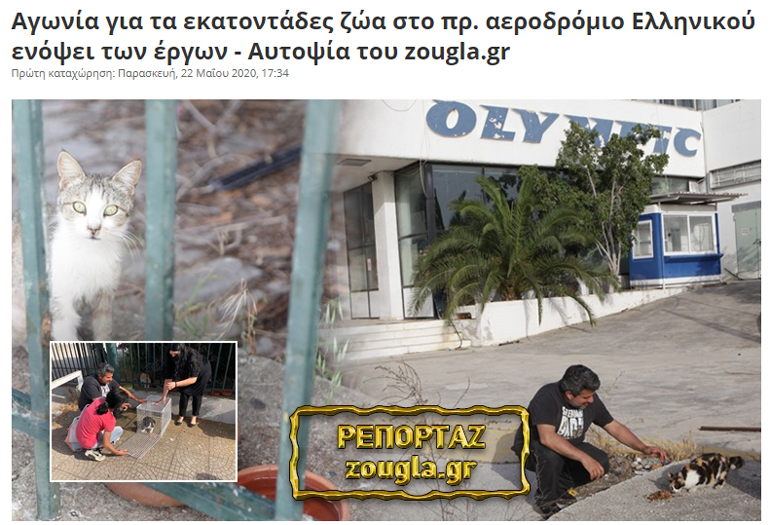Φιλοζωικές οργανώσεις ζητούν τη φιλοξενία αδέσποτων γατιών, που μέχρι σήμερα διαβιούν στον χώρο του πρώην αεροδρομίου Ελληνικού, καθώς σε σύντομο διάστημα θα ξεκινήσουν τα κατασκευαστικά έργα της εν λόγω επένδυσης.