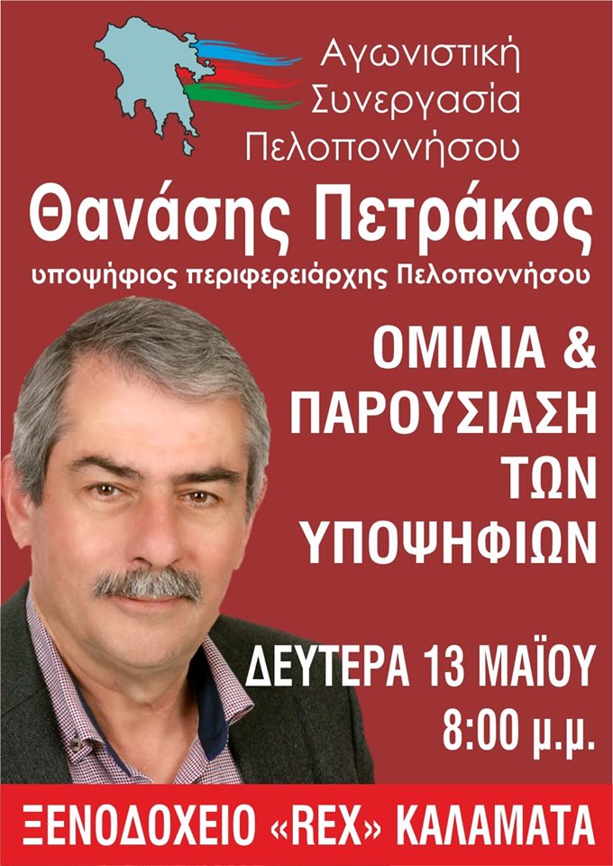 Η «Αγωνιστική Συνεργασία Πελοποννήσου» την Δευτέρα 13 Μαΐου και ώρα 8:00 μ.μ. στην αίθουσα του ξενοδοχείου REX διοργανώνει εκδήλωση με κεντρική ομιλία του υποψήφιου περιφερειάρχη Θανάση Πετράκου και στην παρουσίαση του πλήρους ψηφοδελτίου του συνδυασμού της Πελοποννήσου.