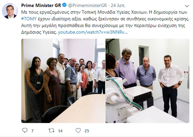 «Με τους εργαζομένους στην Τοπική Μονάδα Υγείας Χανίων. Η δημιουργία των #ΤΟΜΥ έχουν ιδιαίτερη αξία, καθώς ξεκίνησαν σε συνθήκες οικονομικής κρίσης. Αυτή την μεγάλη προσπάθεια θα συνεχίσουμε με την περαιτέρω ενίσχυση της Δημόσιας Υγείας» αναφέρει, μεταξύ άλλων, ο πρωθυπουργός στην ανάρτησή του.