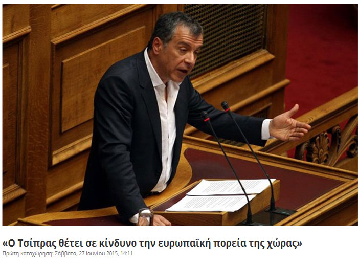 Ο κ. Βενιζέλος χαρακτήρισε ως θεσμική εκτροπή την πρόταση του υπουργικού συμβουλίου και κατηγόρησε την κυβέρνηση για προσπάθεια υφαρπαγής της λαϊκής βούλησης «Είναι ευθέως καταστρατήγηση του Συντάγματος» τόνισε ο κ. Βενιζέλος, υποστηρίζοντας ότι «η πρόταση με τη μετονομασία ως εθνικού ζητήματος αφορά απολύτως δημοσιονομικά ζητήματα. Για τον κατάλογο των μέτρων που είναι κατεξοχήν φορολογικά, το έντιμο και το θαρραλέο από πλευράς κυβέρνησης θα ήταν να θέσει σε δημοψήφισμα τη δική της πρόταση. Τον κατάλογο των 8 δισ. ευρώ, που είπαμε ότι είναι τρενάκι τρόμου σε σχέση με το email Xαρδούβελη» υποστήριξε ο κ. Βενιζέλος.