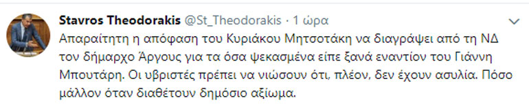 «Απαραίτητη η απόφαση του Κυριάκου Μητσοτάκη να διαγράψει από τη ΝΔ τον δήμαρχο Άργους για τα όσα ψεκασμένα είπε ξανά εναντίον του Γιάννη Μπουτάρη» αναφέρει στην ανάρτησή του στο Twitter ο επικεφαλής του Ποταμιού, Σταύρος Θεοδωράκης.