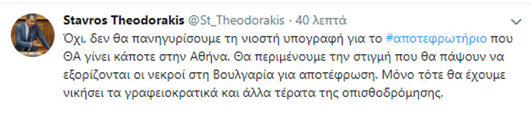 «Όχι, δεν θα πανηγυρίσουμε τη νιοστή υπογραφή για το αποτεφρωτήριο που θα γίνει κάποτε στην Αθήνα. Θα περιμένουμε τη στιγμή που θα πάψουν να εξορίζονται οι νεκροί στη Βουλγαρία για αποτέφρωση. Μόνο τότε θα έχουμε νικήσει τα γραφειοκρατικά και άλλα τέρατα της οπισθοδρόμησης». Αυτό αναφέρει, σε ανάρτησή του στο twitter, ο επικεφαλής του Ποταμιού, Σταύρος Θεοδωράκης, σχολιάζοντας την υπογραφή σχετικής απόφασης από τον υπουργό Περιβάλλοντος και Ενέργειας, Γιώργο Σταθάκη.