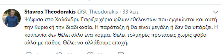 «Ψήφισα στο Χαλάνδρι. Έσφιξα χέρια φίλων εθελοντών που εγγυώνται και αυτή την Κυριακή την διαδικασία. Η παράταξη ή θα είναι μεγάλη ή δεν θα υπάρξει. Η κοινωνία δεν θέλει άλλο ένα κόμμα. Θέλει τολμηρές προτάσεις χωρίς φόβο αλλά με πάθος. Θέλει να αλλάξουμε εποχή».