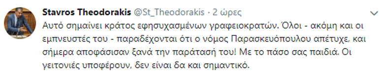 «Αυτό σημαίνει κράτος εφησυχασμένων γραφειοκρατών. Όλοι – ακόμη και οι εμπνευστές του – παραδέχονται ότι ο νόμος Παρασκευόπουλου απέτυχε, και σήμερα αποφάσισαν ξανά την παράτασή του! Με το πάσο σας παιδιά. Οι γειτονιές υποφέρουν, δεν είναι δα και σημαντικό », σχολίασε με μήνυμα στο twitter o επικεφαλής του Ποταμιού, Στ. Θεοδωράκης, για την παράταση ισχύος του νόμου Παρασκευόπουλου.