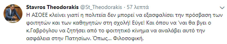 «Η ΑΣΟΕΕ κλείνει γιατί η πολιτεία δεν μπορεί να εξασφαλίσει την πρόσβαση των φοιτητών και των καθηγητών στη σχολή! Εύγε! Και όπου να ‘ναι θα βγει ο κ. Γαβρόγλου να ζητήσει από το φοιτητικό κίνημα να αναλάβει αυτό την ασφάλεια στην Πατησίων. Όπως… Φιλοσοφική».
