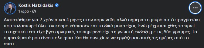 Συγκεκριμένα ανέφερε: «Αντιστάθηκα για 2 χρόνια και 4 μήνες στον κορωνοϊό, αλλά σήμερα το μικρό αυτό πραγματάκι που ταλαιπωρεί όλο τον κόσμο «έσπασε» και το δικό μου τείχος. Ενώ μέχρι και χθες το πρωί το σχετικό τεστ είχε βγει αρνητικό, το σημερινό είχε τη γνωστή ένδειξη με τις δύο γραμμές. Τα συμπτώματά μου είναι πολύ ήπια. Και θα συνεχίσω να εργάζομαι αυτές τις ημέρες από το σπίτι».