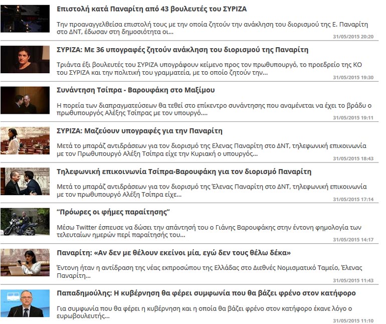 Εν μέσω των διαπραγματεύσεων για τη συμφωνία με τους δανειστές και της τηλεδιάσκεψης με Μέρκελ και Ολάντ, ο πρωθυπουργός, Αλέξης Τσίπρας, κάλεσε το βράδυ της Κυριακής στο Μέγαρο Μαξίμου τον Γιάνη Βαρουφάκη, μετά την ομοβροντία αντιδράσεων στο εσωτερικό του ΣΥΡΙΖΑ για την τοποθέτηση της Έλενας Παναρίτη στο ΔΝΤ.