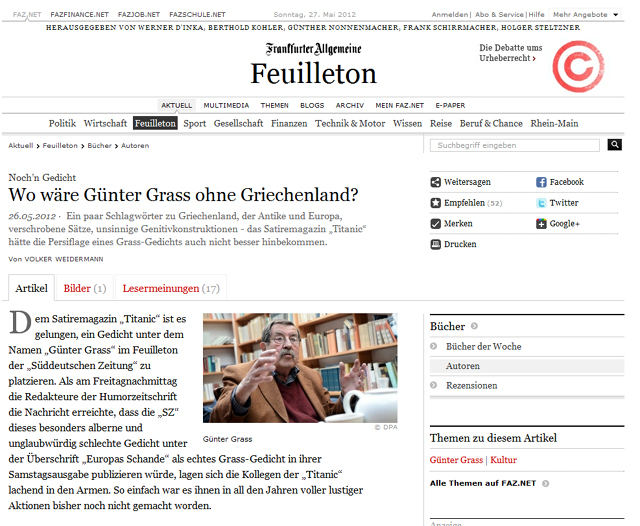 Σύμφωνα με την Frankfurter Allgemeine συντάκτες του σατιρικού περιοδικού «Titanic», γνωστοί για τις φάρσες τους, κατόρθωσαν να πείσουν την Süddeutsche Zeitung ότι το ποίημα είναι γνήσιο. Με τον ειρωνικό τίτλο: «Τι θα έκανε ο Γκίντερ Γκρας χωρίς Ελλάδα», η εφημερίδα τονίζει ότι αυτή τη φορά οι φαρσέρ το παραξήλωσαν, αφού αστειεύονται «με μία χώρα που απειλεί την παγκόσμια ειρήνη».