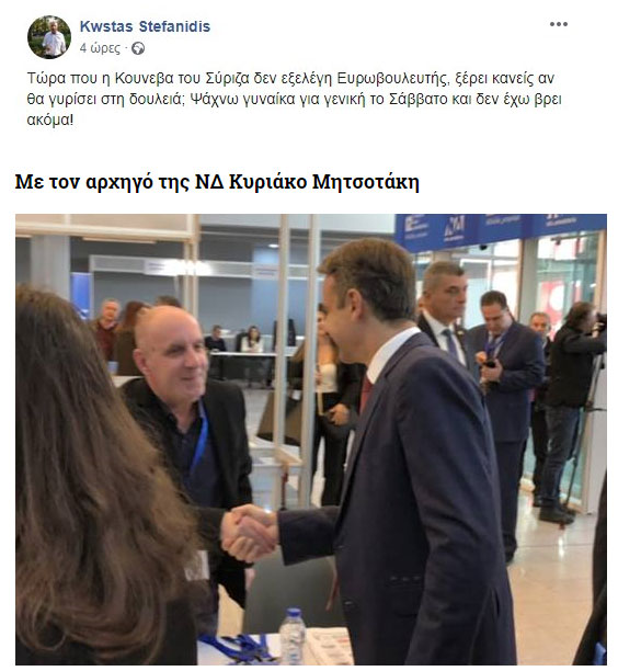 Ο λόγος για το μέλος της Γραμματείας Οργανωτικού και συντονιστή ετεροδημοτών της γαλάζιας παράταξης Κώστα Στεφανίδη, ο οποίος έγραψε στο Facebook: «τώρα που η Κουνεβα του Σύριζα δεν εξελέγη Ευρωβουλευτής, ξέρει κανείς αν θα γυρίσει στη δουλειά; Ψάχνω γυναίκα για γενική το Σάββατο και δεν έχω βρει ακόμα!».