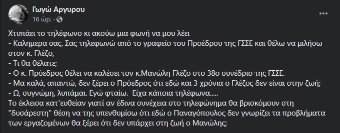 Το έκλεισα κατ΄ευθείαν γιατί αν έδινα συνέχεια στο τηλεφώνημα θα βρισκόμουν στη “δυσάρεστη” θέση να της υπενθυμίσω ότι εδώ ο Παναγόπουλος δεν γνωρίζει τα προβλήματα των εργαζομένων θα ξέρει ότι δεν υπάρχει στη ζωή ο Μανώλης;».