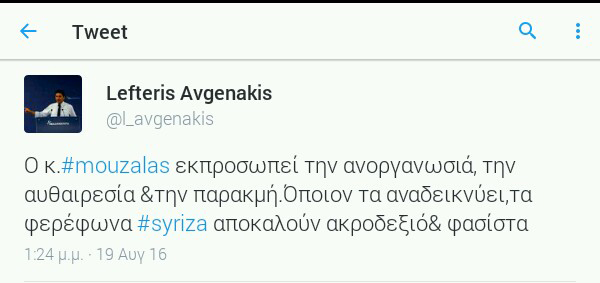 Ο Γραμματέας της Ν.Δ. Λευτέρης Αυγενάκης έγραψε στον προσωπικό του λογαριασμό στο Twitter: