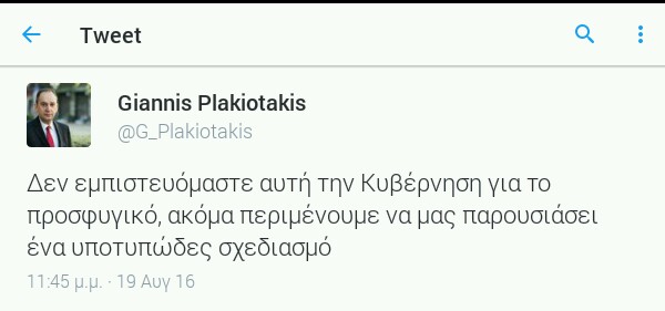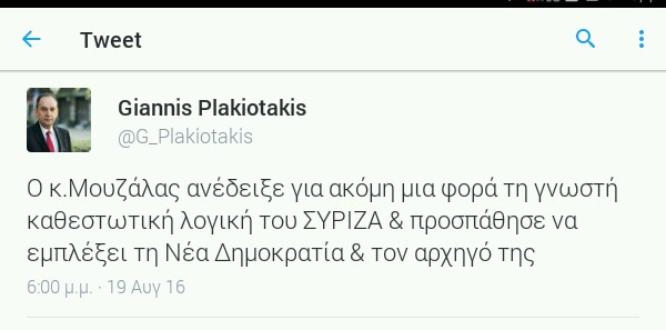 Μέσω του Twitter επιτέθηκε στην Κυβέρνηση και ο τ. Πρόεδρος της Ν.Δ. Γιάννης Πλακιωτάκης: