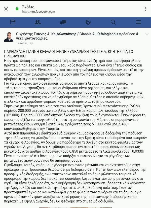 O Τομεάρχης Εξωτερικών Υποθέσεων της Ν.Δ. Γιάννης Κεφαλογιάννης, μέσω του προσωπικού λογαριασμού στο Facebook έγραψε χαρακτηριστικά: «Αυτό που παρουσιάζει ιδιαίτερο ενδιαφέρον και μας αφορά με δεδομένη την πρόθεση της κυβέρνησης να φιλοξενήσει μετανάστες στην Κρήτη είναι τα δεδομένα που αφορούν τα κέντρα φιλοξενίας. Αν δούμε για παράδειγμα τι συνέβη στα κέντρα φιλοξενίας των νησιών του Αιγαίου, θα αντιληφθούμε πως σε εγκαταστάσεις που έχουν δηλώσει ως μέγιστο δυνατό αριθμό φιλοξενίας τους 6.850 μετανάστες τελικά φιλοξενούν 10.033! Γίνεται αντιληπτό ότι δεν μπορεί να υπάρξει εμπιστοσύνη για το μέγεθος των μεταναστευτικών ροών που θα απορροφήσουμε».