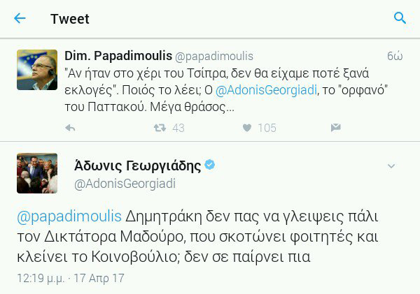 Σκληρότατη απάντηση έδωσε ο Αντιπρόεδρος της Νέας Δημοκρατίας, Άδωνις Γεωργιάδης στον Ευρωβουλευτή του ΣΥΡΙΖΑ, Δημήτρη Παπαδημούλη, όταν ο δεύτερος, έγραψε στον προσωπικό του λογαριασμό στο Twitter, σχολιάζοντας τη συνέντευξη του κ. Γεωργιάδη: «Αν ήταν στο χέρι του Τσίπρα, δε θα είχαμε ποτέ ξανά εκλογές. Ποιος το λέει αυτό; Ο Άδωνις Γεωργιάδης, το ορφανό του Παττακού. Μέγα θράσος…».