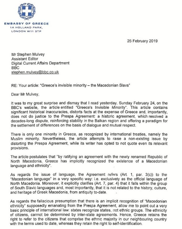 Ο πρέσβης της Ελλάδας στο Λονδίνο ενεχείρισε επιστολή διαμαρτυρίας του ελληνικού Υπουργείου Εξωτερικών προς το βρετανικό BBC για το ανώνυμο και ανυπόγραφο δημοσίευμα του ενημερωτικού αυτού ομίλου που έθετε ζήτημα «εθνικής μακεδονικής μειονότητας στην Ελλάδα».