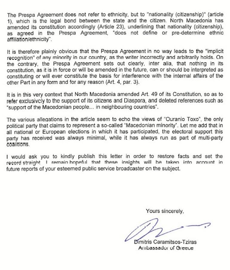«Διάβασα με ιδιαίτερη έκπληξη και απογοήτευση το δημοσίευμα της ιστοσελίδας του έγκριτου οργανισμού σας χθες, Κυριακή 24 Φεβρουαρίου, με τίτλο “Greece’s Invisible Minority”, το οποίο περιείχε σημαντικές ιστορικές ανακρίβειες και διαστρεβλώσεις εις βάρος της Ελλάδας, ενώ αδικεί τη Συμφωνία Πρεσπών. Μια ιστορική συμφωνία, η οποία επέλυσε μια διαμάχη δεκαετιών, συνέβαλε στη σταθεροποίηση της περιοχής των Βαλκανίων και έστειλε ένα γενικότερο μήνυμα υπέρ της επίλυσης διεθνών διαφορών με βάση το διάλογο και τον αμοιβαίο σεβασμό.