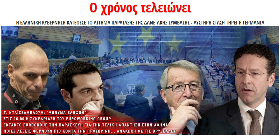 Λίγο πριν από τις 11.00 το πρωί εστάλη το ελληνικό αίτημα για παράταση στις Βρυξέλλες. Μέσω αυτού, η Αθήνα ζητά την παράταση της δανειακής σύμβασης και σε καμία περίπτωση του προγράμματος/μνημονίου.