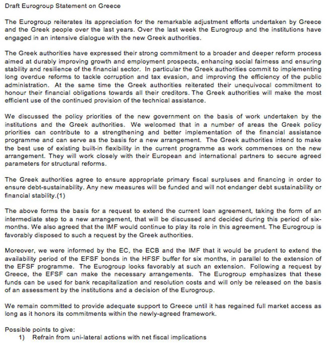 Τα ανωτέρω αποτελούν τη βάση για ένα αίτημα για την παράταση του ισχύοντος δανειακού προγράμματος, το οποίο θα πάρει τη μορφή ενός ενδιάμεσου βήματος προς μια νέα συμφωνία οι λεπτομέρειες της οποίας θα συζητηθούν και θα αποφασιστούν σε μία περίοδο έξι μηνών. Συμφωνήσαμε επίσης πως το ΔΝΤ θα συνεχίζει να παίζει τον ρόλο του σε αυτή τη συμφωνία. Το Eurogroup είναι θετικά προδιατεθημένο για μία τέτοια πρόταση από την Ελληνική πλευρά.