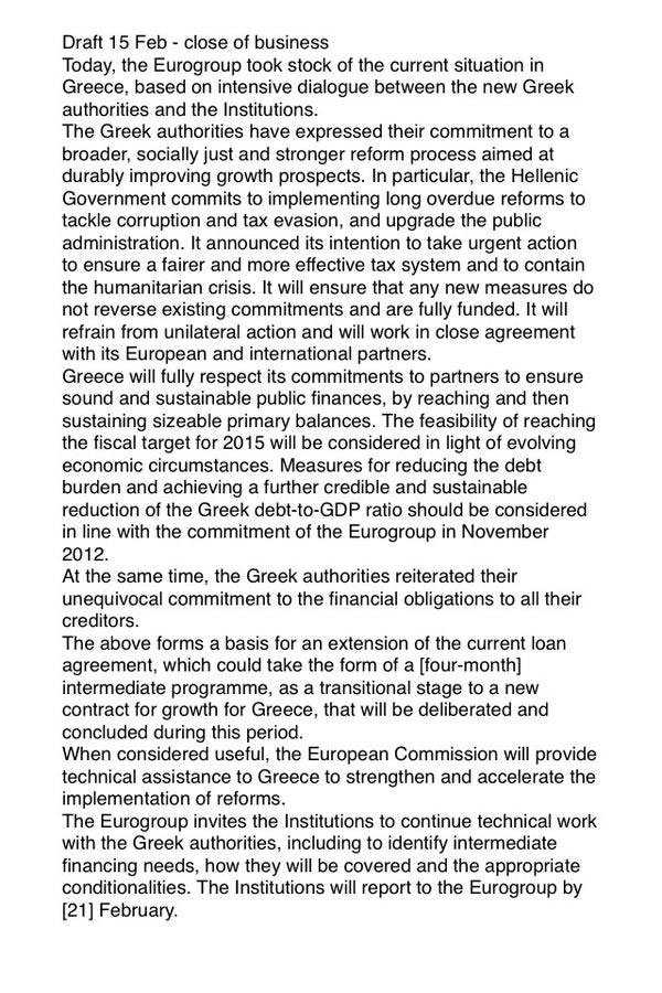 Τα παραπάνω διαμορφώνουν τη βάση για μια παράταση της υφιστάμενης δανειακής συμφωνίας, η οποία θα μπορούσε να πάρει τη μορφή ενός ενδιάμεσου προγράμματος [τεσσάρων μηνών] σαν ένα μεταβατικό στάδιο σε ένα νέο συμβόλαιο για την ανάπτυξη για την Ελλάδα το οποίο θα μελετηθεί και θα συμφωνηθεί κατά τη διάρκεια της περιόδου.