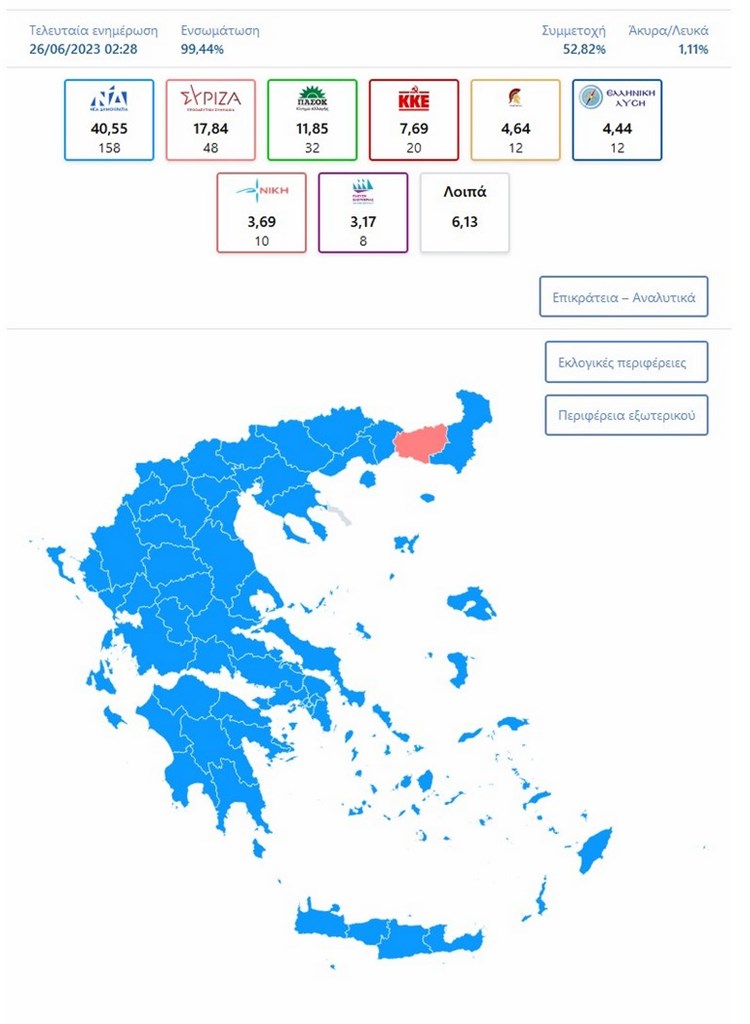 Σύμφωνα με τις μετρήσεις του υπουργείου Εσωτερικών και της Singular Logic, με ποσοστό ενσωμάτωσης 99,44%, τα αποτελέσματα διαμορφώνονται ως εξής: