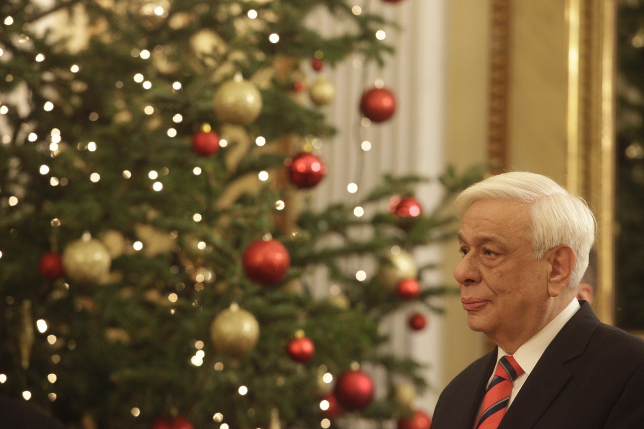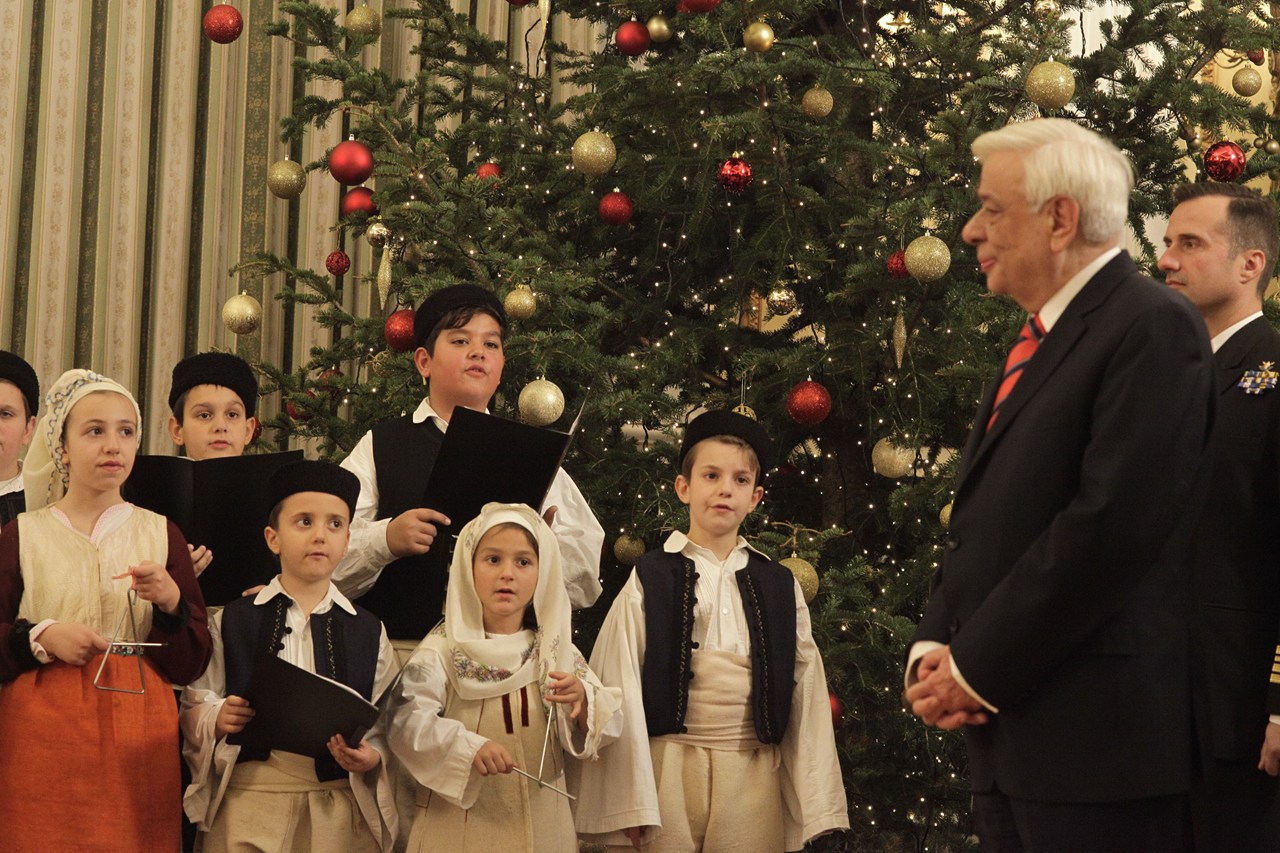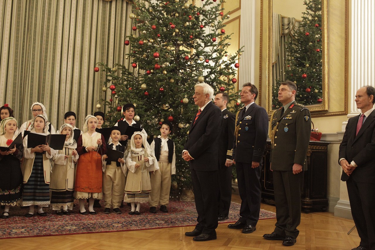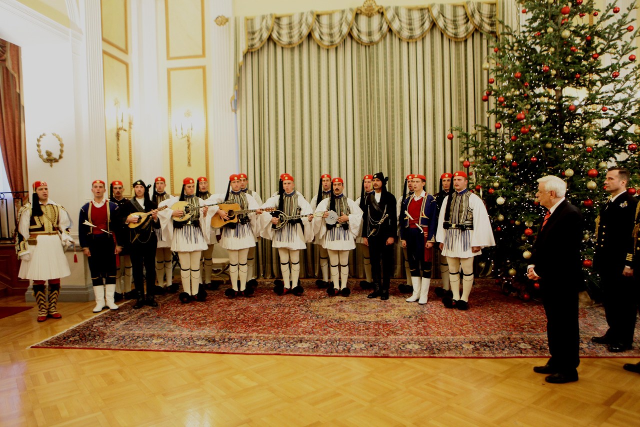 Τα κάλαντα στον Πρόεδρο της Δημοκρατίας έψαλε η Μπάντα των Ενόπλων Δυνάμεων και η Προεδρική Φρουρά στο Προεδρικό Μέγαρο.