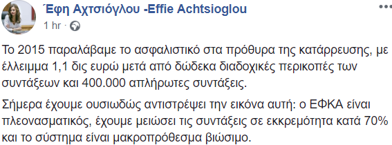 «Το 2015, παραλάβαμε το ασφαλιστικό στα πρόθυρα της κατάρρευσης, με έλλειμμα 1,1 δισ. ευρώ, μετά από 12 διαδοχικές περικοπές των συντάξεων και 400.000 απλήρωτες συντάξεις. Σήμερα, έχουμε ουσιωδώς αντιστρέψει την εικόνα αυτή. Ο Ενιαίος Φορέας Κοινωνικής Ασφάλισης (ΕΦΚΑ) είναι πλεονασματικός, έχουμε μειώσει τις συντάξεις σε εκκρεμότητα κατά 70% και το σύστημα είναι μακροπρόθεσμα βιώσιμο» σχολιάζει η υπουργός Εργασίας.