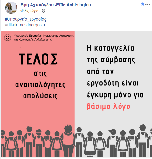 Ανάρτηση στο facebook για τις αναιτιολόγητες απολύσεις εργαζομένων έκανε σήμερα η υπουργός Εργασίας, Έφη Αχτσιόγλου...