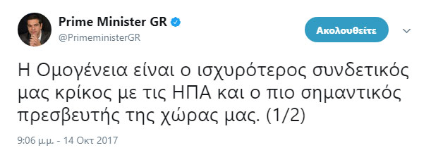 «Η Ομογένεια είναι ο ισχυρότερος συνδετικός μας κρίκος με τις ΗΠΑ και ο πιο σημαντικός πρεσβευτής της χώρας μας», σημείωσε ο Αλέξης Τσίπρας μέσω Twitter μετά τη συνάντηση.