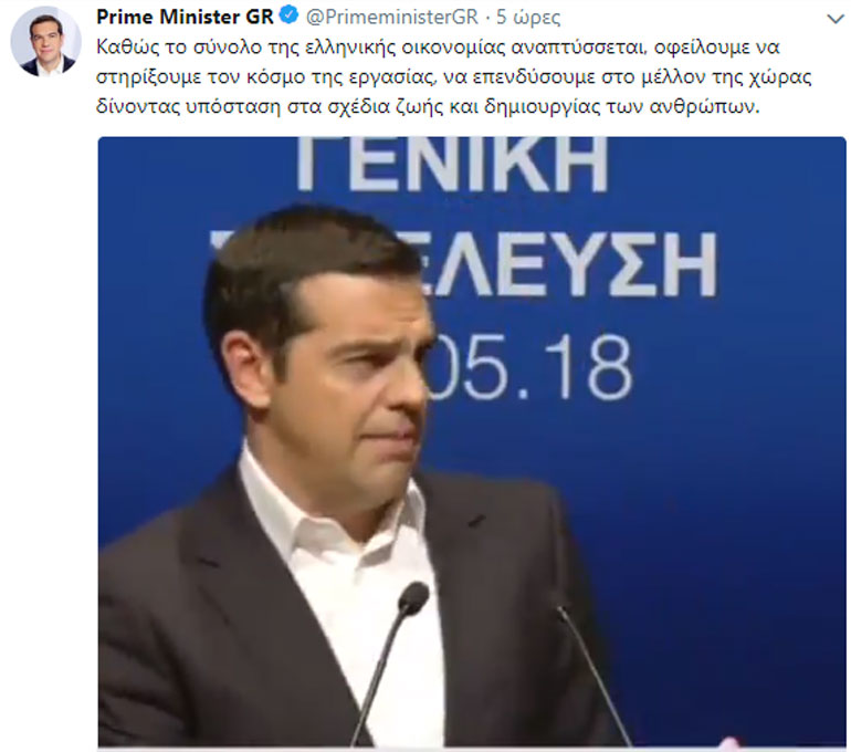 «Καθώς το σύνολο της ελληνικής οικονομίας αναπτύσσεται, οφείλουμε να στηρίξουμε τον κόσμο της εργασίας, να επενδύσουμε στο μέλλον της χώρας δίνοντας υπόσταση στα σχέδια ζωής και δημιουργίας των ανθρώπων» σημειώνει χαρακτηριστικά στην ανάρτησή του ο πρωθυπουργός η οποίο συνοδεύεται με το παρακάτω απόσπασμα από την ομιλία του στο ΣΕΤΕ: