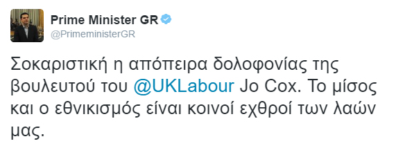 Για «σοκαριστική απόπειρα δολοφονίας» κατά της βουλευτού των Εργατικών Τζο Κοξ, έκανε λόγο πρωθυπουργός Αλέξης Τσίπρας...