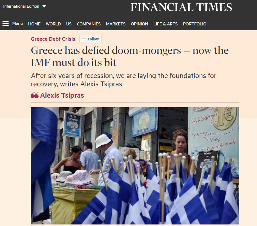 «Μετά από έξι χρόνια ύφεσης, βάζουμε τα θεμέλια για την ανάκαμψη» αναφέρει ο πρωθυπουργός Αλέξης Τσίπρας με άρθρο του στους Financial Times, ενώ καλεί το ΔΝΤ να κάνει το χρέος του, σημειώνοντας ότι η Ελλάδα διέψευσε τις Κασσάνδρες.