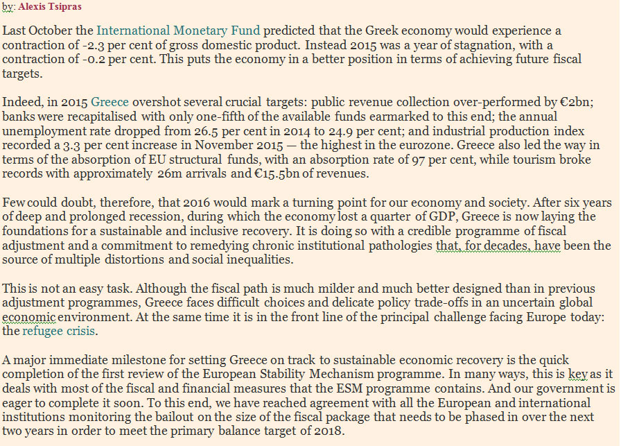 «Τον Οκτώβριο του 2015 το Διεθνές Νομισματικό Ταμείο προέβλεψε ότι η ελληνική οικονομία θα κατέγραφε ύφεση 2,3% του ΑΕΠ. Αντίθετα, το 2015 ήταν μια χρονιά οικονομικής στασιμότητας, με μια ύφεση 0,2%. Η επίδοση αυτή φέρνει την οικονομία σε καλύτερη θέση όσον αφορά την επίτευξη μελλοντικών δημοσιονομικών στόχων.