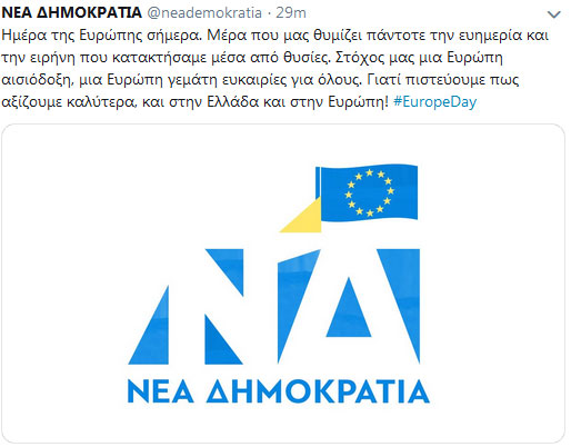 Μέσω ανάρτησής της στο Twitter, η ΝΔ σχολιάζει για τη σημερινή ημέρα της Ευρώπης πως «πρόκειται για ημέρα που θυμίζει την ευημερία και την ειρήνη».