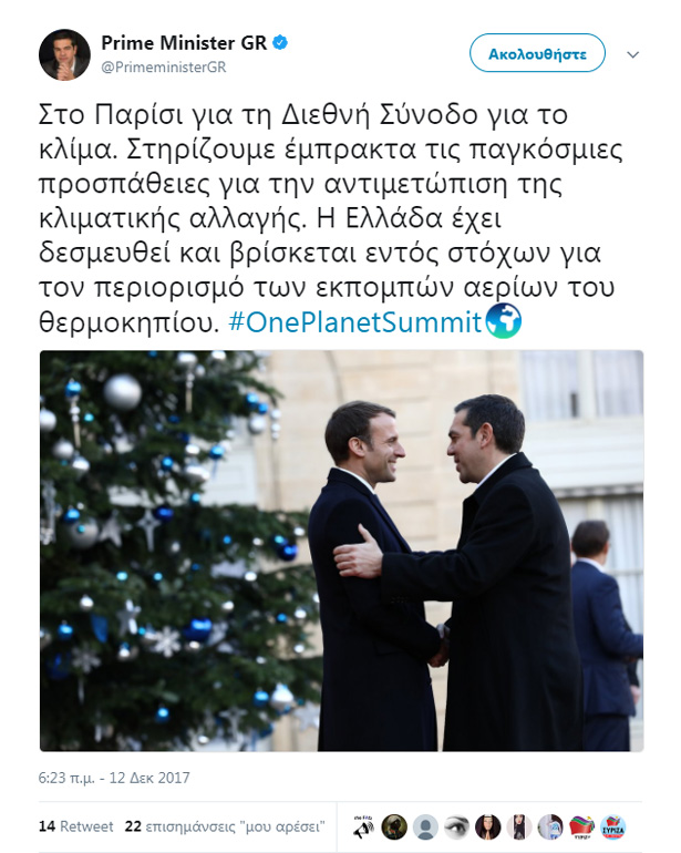 «Στο Παρίσι για τη Διεθνή Σύνοδο για το κλίμα. Στηρίζουμε έμπρακτα τις παγκόσμιες προσπάθειες για την αντιμετώπιση της κλιματικής αλλαγής. Η Ελλάδα έχει δεσμευτεί και βρίσκεται εντός στόχων για τον περιορισμό των εκπομπών αερίων του θερμοκηπίου. #OnePlanetSummit».